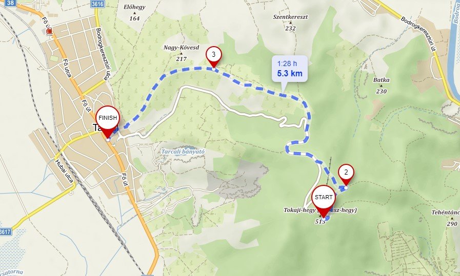 A Kopasz-hegy (513m) tetején áll a 112 méter magas Tokaji Tv-torony, mely 1960-ban épült és 2013 végig TV-URH gerincadó állomásként működött. Ugyan kilátóként nem üzemel, de tiszta időben gyönyörű kilátás nyílik szinte az egész Hegyaljára és az Alföldre. A hegy tetejéről a piros háromszög jelzésen indulunk el, majd  a piros vízszintes turistajelzést követjük a szánkópályán keresztül, egészen az aszfaltútig. A piros kereszt jelzést keressük, mert az utat építési munkálatok miatt lezárták, így ez az út tovább nem folytatható a Tarcali-tó irányába. A szőlőbirtokok és gyümölcsösök közt haladva a piros négyzet turistajelzésen folytatjuk utunkat, de nagyon figyeljünk arra, hogy ne csak a térkép vagy a navigáció jelzéseit kövessük, hanem a földek mellett elhaladva keressük a piros négyzet jelzést, mert időközben az útvonalat módosították és ha letérünk az útról, könnyen eltévedhetünk.  A szőlőbirtokok elhagyása után a piros négyzet jelzésen érjük el a falut.