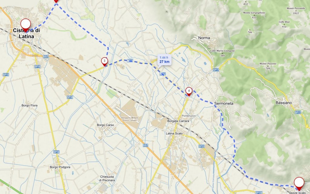 Túránk Sezze Scalo-ból indul. Eleinte a vasút mellet halad utunk, majd hegység aljában tekerünk Sermoneta irányába. A várost nem érintjük alatta fogunk eltekerni. Innen már távolodunk kissé a hegyektől. De jó darabig velünk lesz a Monti Lepini ezer méter fölötti csúcsainak látványa. Érdemes a térképet nézni, mert lesz pár elágazás. Szerencsére nincs nagy forgalom ezeken az útszakaszokon, így sokkal kellemesebb a túra. Utunk végén megérkezünk Cisterna di Latina központjába, ahol érdemes kicsit nézelődni. |
