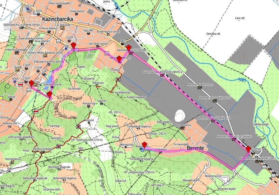Berentei tó partjáról indulva, áttekerünk a városon ( figyelve az egyirányú útra, nem hajtunk be egyenesen, jobbra tartva megyünk a helyes irányba) Sajószetpéter felé. A BorsodChem végénél balra fordunk, egészen a kerékpárútig tekerünk. Itt balra fordulva egészen Kazincbarcikáig tekerünk. Az út utolsó egy km-re eléggé elhanyagolt "kerékpárút". A város elején balra fordulunk, eltekerünk a tűzoltóság előtt, egészen a kerékpárútig. Itt jobbra haladva követjük a kerékpárutat, egészen a körforgalomig. Itt ketté ágazik mi balra tartunk és megyünk rajta tovább. Egészen addig még az utca végén szintén ketté válik, mi az úton áthaladva balra tartunk. Innen 100 méterre letérünk a kerékpárútról, szintén balra. A Jókai szakközépiskola előtt elhaladva, eltekerünk a Csónakázó tóig. A túra két végén van igazi látnivaló, a gyár mellett eltekerve ez nem mondható el.