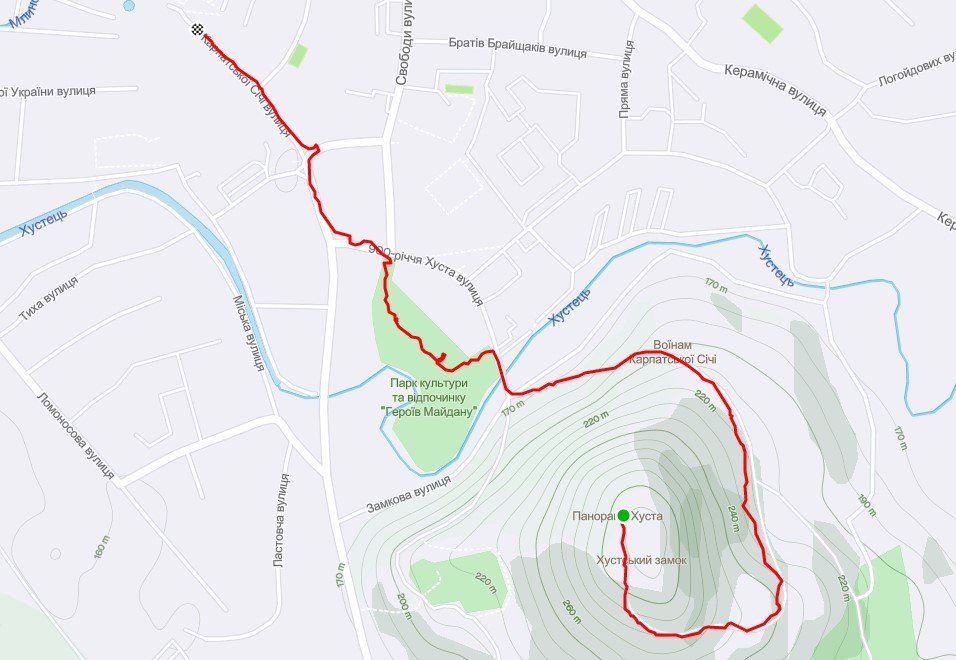 Túránk Huszt belvárosából indul a városi park irányába. A városközpont és park is nagyon szép, érdemes bejárni. A park másik oldalán jövünk ki, át a folyón. Utána balra a hegy alatt vezet az út a vár felé, szinte egy kört fogunk megtenni mire feljutunk. A vár sajnos már csak romjaiban látható. Valamint csodálatos kilátás nyílik a környékre. Miután bejártuk a várat, ugyanezen az útvonalon jutunk vissza a városközpontba.